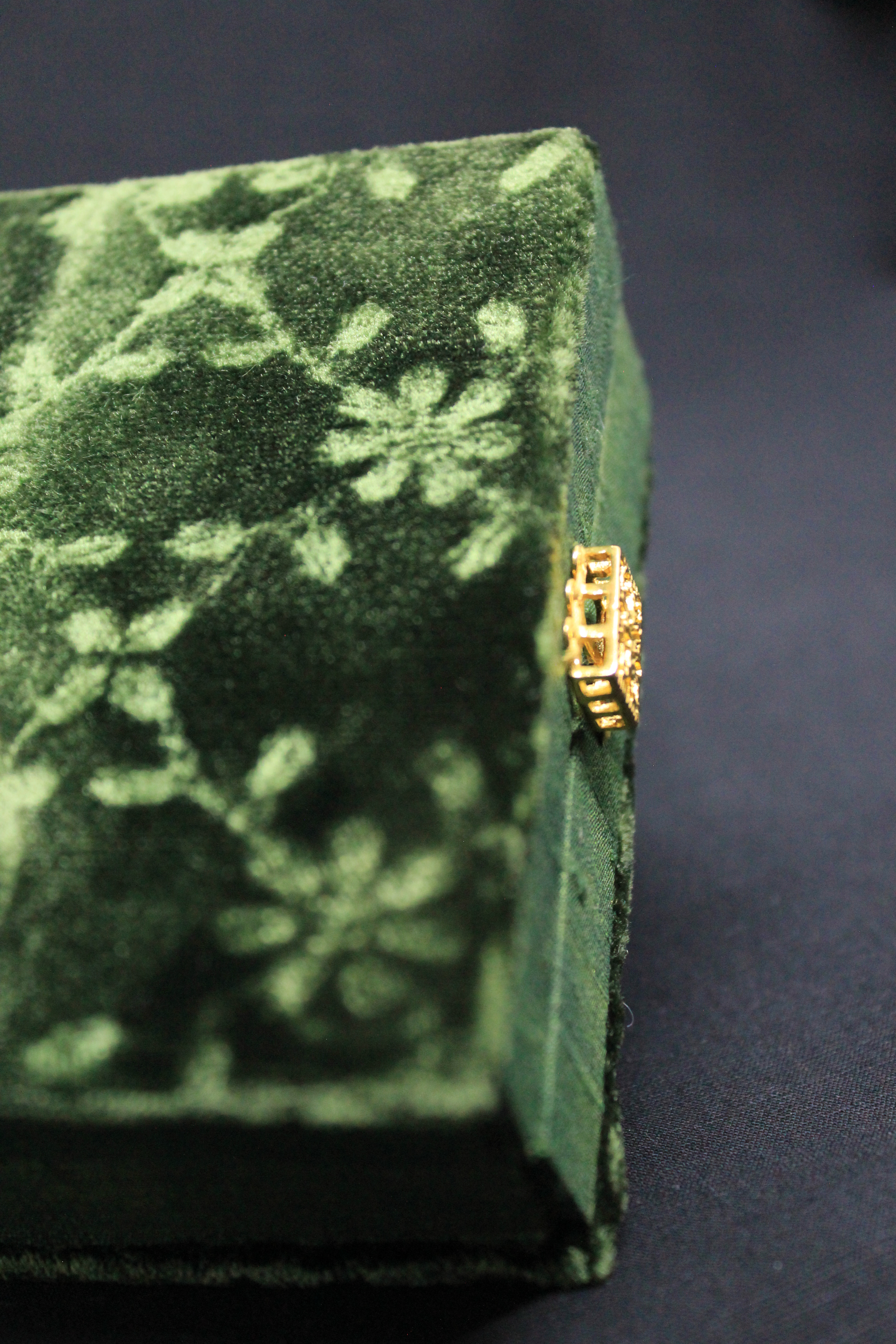 Izšuvums samta kastītē ir roku darbs. Darba pamatā ir vairākas izšūšanas tehnikas, tai skaitā izšuvums ar metāliskajiem “diegiem” zeltā, “melnie darbi” un aplikācija. Izmantotie materiāli ir dabīga sastāva audumi, vairāku veidu metālizstrādājumi t.sk. furnitūra, kartons, diegi. Kastīte veidota no 20 gab. ar roku grieztiem un audumu apvilktiem, sašūtiem paneļiem.