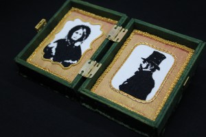 This embroidered double portrait in a velvet box is fully hand-made. It involves such embroidery techniques as goldwork, blackwork, needlepainting, applique. The used materials are fabrics of natural fiber, like silk and cotton, various metalwork, cardboard, and threads. The box is made of 20 separately measured and manually cut panels covered with fabric and stitched together, the velvet is hand embossed as well.