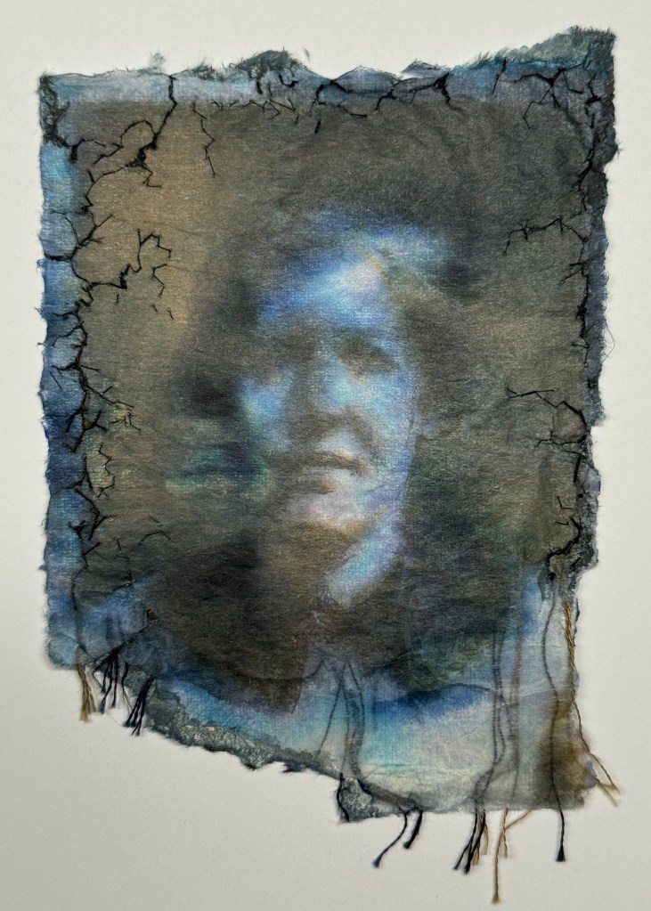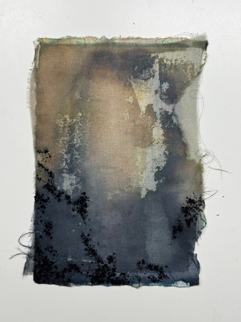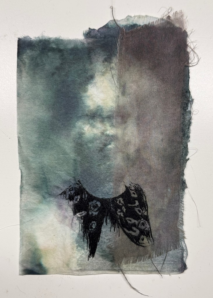 Materials used: paper, ink, organza, threads. Size: ~16×11 cm