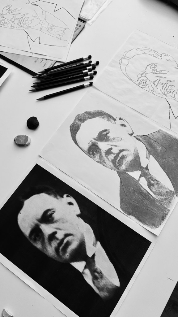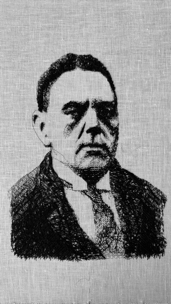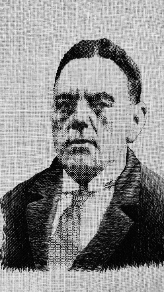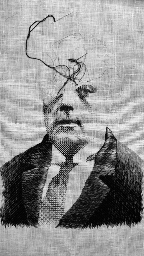 When you enter the RSU Anatomy museum in Riga, the first exhibit that greets you is a skeleton of a 27-year old male. His name is Janis Teodors Lukstins and he is the first willful donor of a human body to the museum’s collection. In a weird way he is also my coworker, being the senior colleague generously sharing a room with me. As a skeleton, he has served the museum from 1925 and his main responsibility is to remind all visitors that every exhibit at the Anatomy Museum is not only a piece of scientific heritage, but once was part of a living human body. As part of my studies at the Royal School of Needlework (UK), I decided to pay my respects and embroider the portrait of Janis Teodors Lukstins and tell his story.